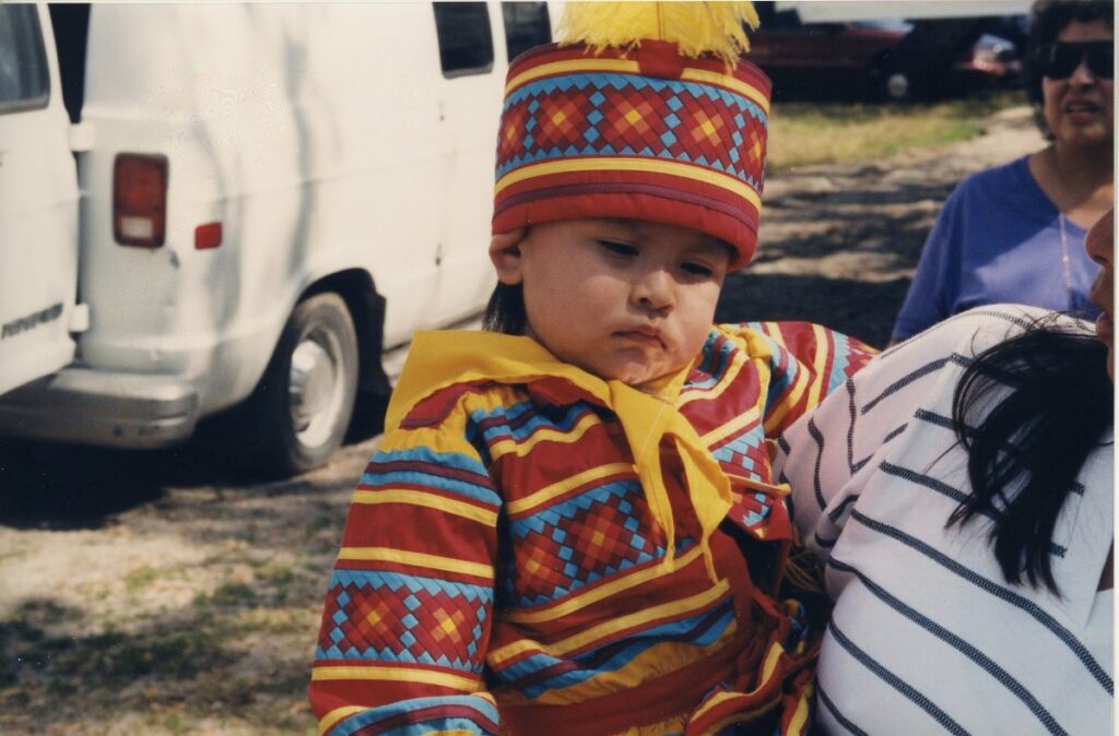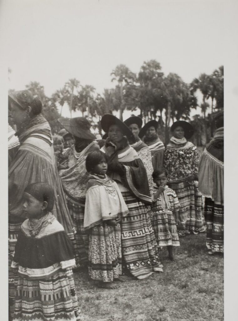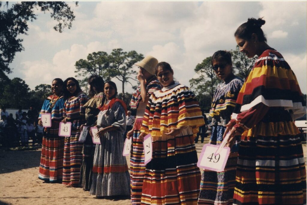 Seminole patchwork, clothing styles, and fashion are an integral part of Seminole culture and tradition. Clothing contests are a popular facet of many Seminole events! Make sure to check out some of the amazing pieces that Seminole artisans have created for these beloved competitions. Above, you can see young entrant to a clothing contest at a past Brighton Field Day Event. (2015.6.9537, ATTK Museum)