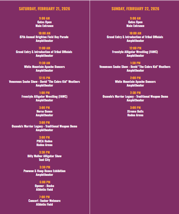 Festival season isn’t over yet! Over the month of February, we have danced at Tribal Fair and listened to some incredible musicians at the Big Cypress Indigenous Arts and Music Festival. But don’t fret. There is one more unique and special Seminole event to add to your calendars this winter festival season! The Brighton Field Day Festival & Rodeo starts tomorrow, February 19th. Get ready for an action packed four-day event full of rodeo competitions, vendors, alligator wrestling, carnival rides, a Saturday concert experience, and more. Need more details? Follow along in this post as we give a sneak peek into each of these entertainment experiences. Check out the schedule, so you can plan your perfect Brighton Field Day!