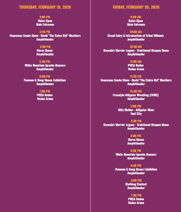 Alongside the FAW competitions, renowned alligator wrestler Billy Walker will wow crowds with a series of thrilling wildlife and alligator shows throughout the weekend. A fan favorite at Seminole events, Walker brings decades of hands-on experience and unmatched expertise to the arena.