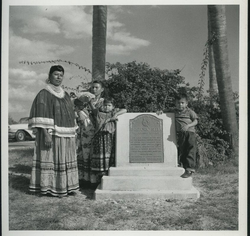 In our featured image, you can see Lena Gopher, Shule Snow Jones (with baby), Mary Jo Jones, and Parker Jones standing around the monument honoring Chief Tallahassee’s camp near Lake Wales, Florida in 1958 when it was dedicated. The inscription on the monument reads: “On Lake Pierce is the site of the Seminole camp of Chief Tallahassee, who succeeded Chief Chipco, leader of the Creek Seminoles. Chief Chipco is buried nearby. The village was abandoned about 1890.”
