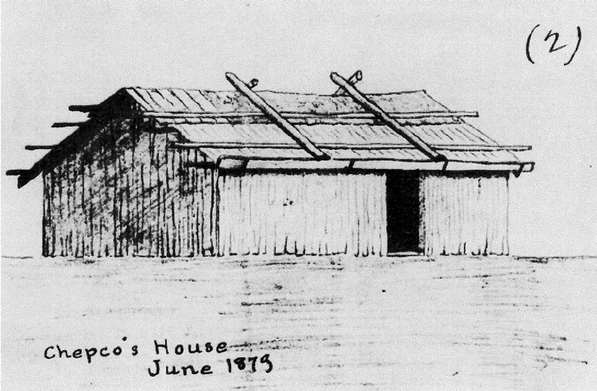 Returning from the Everglades following the Third Seminole War, Chipco would set up his camp back in Polk County, near Lake Pierce. In 1879 Lt. Richard Henry Pratt was sent by the U.S. Commissioner of Indian Affairs to investigate the circumstances of the Seminoles of Florida. His report was revived and annotated by William C. Sturtevant in 1956. He described Chipco’s village as sitting at “a slight elevation in the piney woods, in vicinity of clear, beautiful lakes,” with about 10 buildings “equal in comfort to those of many of their white neighbors.” Below, you can see a drawing from that trip. Notably, Chipco lived in something more reminiscent of a log cabin, instead of the typical Seminole chickee.
