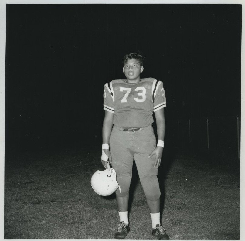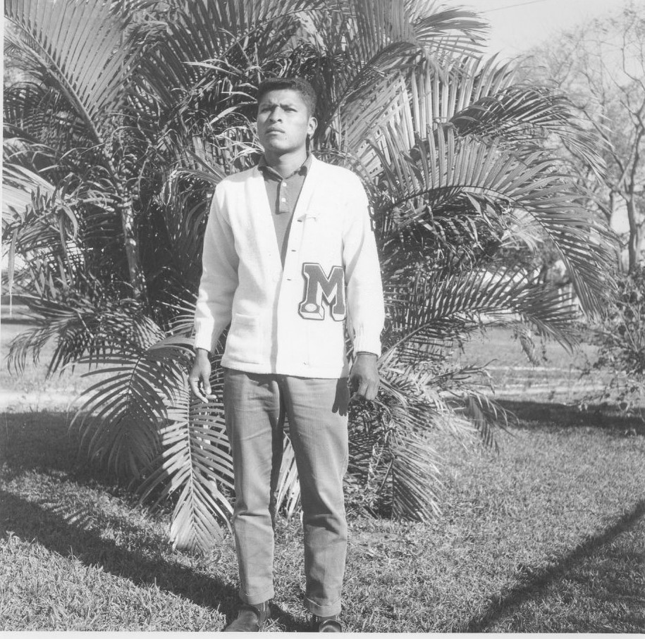 Eugene Bowers in a letterman jacket, 1960. Bowers was the star football player at McArthur High School in Hollywood, FL. He was known as “Tank” and would go on to be one of the first inductees into the Seminole Hall of Fame.