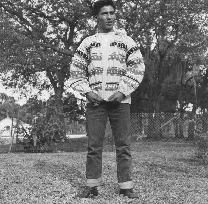 Well known for his important and transformative work as a leader and youngest (and first!) Tribal President, Joe Dan Osceola was also an amazing athlete. He was an incredible football, baseball, and track star. Osceola graduated from Okeechobee High School where he was the quarterback of the football team, as well as being the captain of the basketball team. He was one of the first Seminoles to attend a public Florida school, as well as the first to graduate from a public Florida school. Below, you can see him in March 1957 while a high senior, posing for William Boehmer.