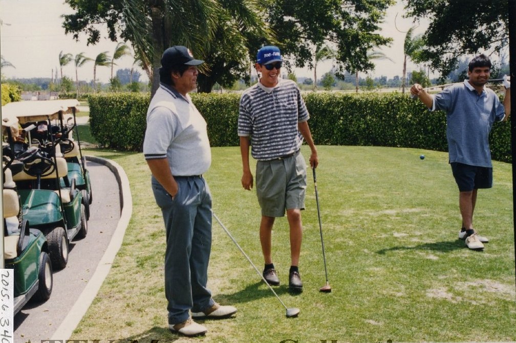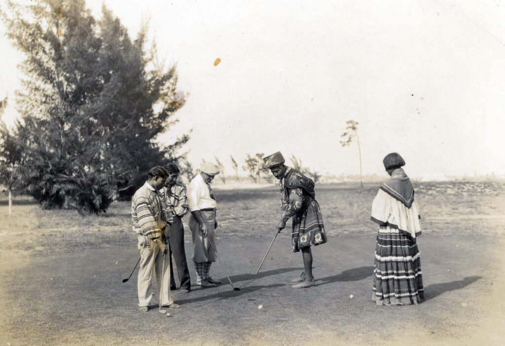 Golf has continued to be a well-loved pastime for many Seminole Tribal members throughout the decades. If you look through the Ah-Tah-Thi-Ki Museum Collection, you will find a vast array of images of men, women, and children enjoying golf both recreationally and in a tournament setting. Below, Bobby Frank, Hootie Whitecloud, and Tyrone Cypress (L-R) enjoy a game at the Howard Tiger Memorial Golf Tournament, date unknown. The image was taken by Elrod Bowers.