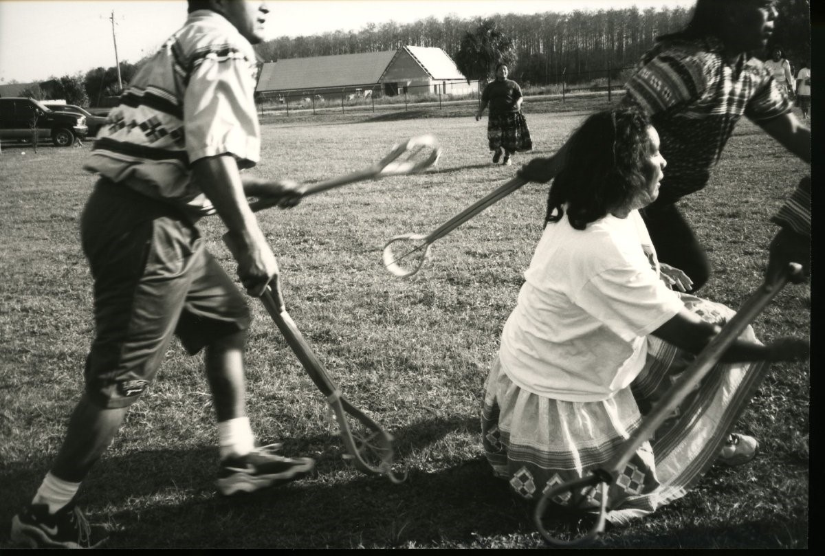 Stickball is the quintessential traditional Seminole game that most people think of, and an important cultural touchstone. Similar in a lot of ways to lacrosse, Seminoles and many other Southeastern tribes have played stickball for centuries. In fact, Choctaw stickball was recently featured in Disney’s Marvel show Echo. It traditionally is used to settle disputes and strengthen social ties at large gatherings. Players use two rackets and a leather ball. In our featured image you can see a group of men and woman playing stickball. They are at the Kissimmee Slough Shootout and Rendezvous, Ah-Tah-Thi-Ki Museum, Big Cypress, February 2-3, 2001. The curatorial building under construction can be seen in the background. (2016.14.159).