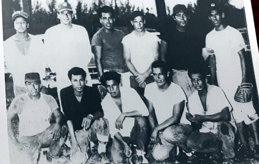 Joe Dan Osceola, at the far right in the back row, played semi-pro baseball on a Seminole team in the early 1960s. Others in the photo include, back row, from left, Eugene Bowers, Howard Tiger, George Storm, (unknown), and Jessie Osceola; and in the front row, from left, Bobbie Osceola, Jimmy Hank Osceola, Max Billie, Jackie Willie Sr. and Sandy Billie Sr.