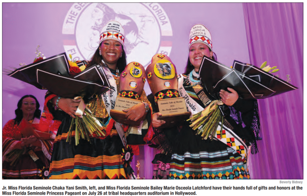 Just a few months ago Miss Florida Seminole Bailey Marie Osceola Latchford and Jr. Miss Florida Seminole Chaka Yani Smith were crowned at the 68th annual Miss Florida Seminole Princess Pageant in Hollywood, FL. Although only a few months into their reign, they are already making their mark! Latchford currently attends Florida State University (FSU) and is pursuing her degree in social work and criminal justice. She is a member of the NAACP and the membership chair for the Big Sister Little Sister organization. Last December Latchford was also a speaker at the dedication for the new Native American & Indigenous Studies Center on the FSU Campus.