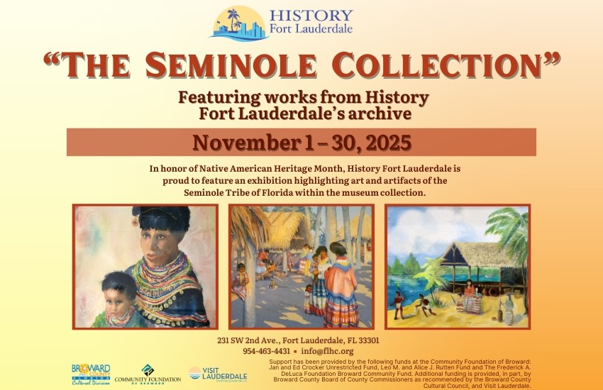 Exhibited in honor of Native American History Month, this showcase highlights art and artifacts from within History Fort Lauderdale’s collection that celebrate and honor the Seminole Tribe of Florida’s history. “History Fort Lauderdale is proud to showcase the rich cultural and artistic contributions of the Seminole Tribe of Florida year-round, but especially during Native American Heritage Month,” said Patricia Zeiler, executive director of History Fort Lauderdale. “This curated collection features archival works and important artifacts depicting the shared experiences of our indigenous ancestors. From family life portraits to landscapes to beadwork, we invite the community to join us in honoring the spirits of those who paved the way for our great City’s success.”